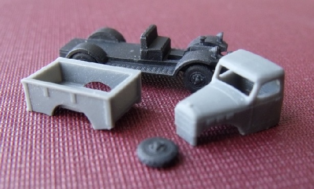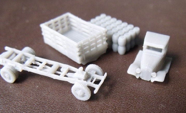 This is a 4 piece kit which includes a 3D printed chassis, a 3D printed cab, a 3D printed cargo bed and a 3D printed load. Also included, decals.