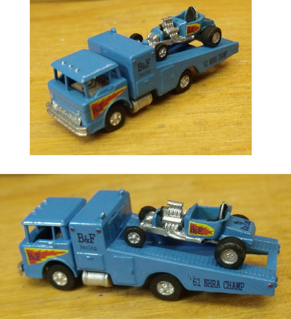 This kit is a scale model of a 1957 C series cab-over-engine truck. The kit contains all the parts needed to build a race car transporter (with a drag racer).