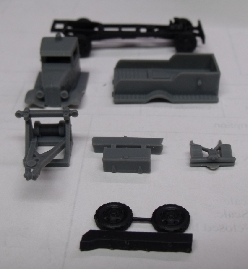 This kit includes 8 3D printed parts; chassis, cab, tow bed, hoist, tool chest, lifting frame and 2 spare wheels. Also included, one sheet of decals and fine wire.