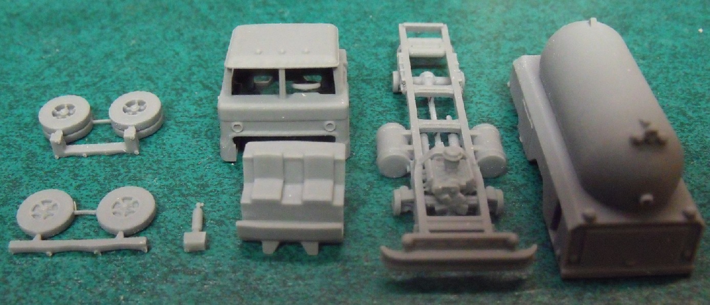 The tanker kit includes 4 3D printed parts; chassis, cab, tanker bed and fire extinguisher. Also included, one sheet of decals.