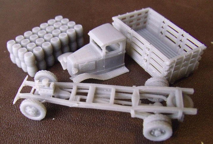 This is a 4 piece kit which includes a 3D printed chassis, a 3D printed cab, a 3D printed cargo bed and a 3D printed load. Also included, decals.